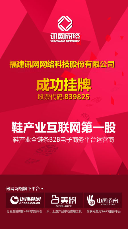 此次訊網(wǎng)網(wǎng)絡(luò)掛牌,正式成為國內(nèi)鞋產(chǎn)業(yè)互聯(lián)網(wǎng)“第一股”,彰顯了公司作為鞋行業(yè)互聯(lián)網(wǎng)資訊第一平臺(tái)、B2B在線交易領(lǐng)先平臺(tái)的行業(yè)地位。下一步,公司將利用供給側(cè)改革、制造升級(jí)、B2B電商風(fēng)口等發(fā)展機(jī)遇,以“經(jīng)緯鑄球,閉環(huán)生態(tài)”為業(yè)務(wù)架構(gòu),打通鞋行業(yè)上中下游企業(yè)及產(chǎn)品這一用戶“經(jīng)線”,建立企業(yè)專業(yè)資訊、在線交易、供應(yīng)鏈金融、數(shù)據(jù)服務(wù)這一業(yè)務(wù)“緯線”,開放聯(lián)結(jié),構(gòu)建起連接鞋企一切互聯(lián)網(wǎng)需求的電商生態(tài)圈。